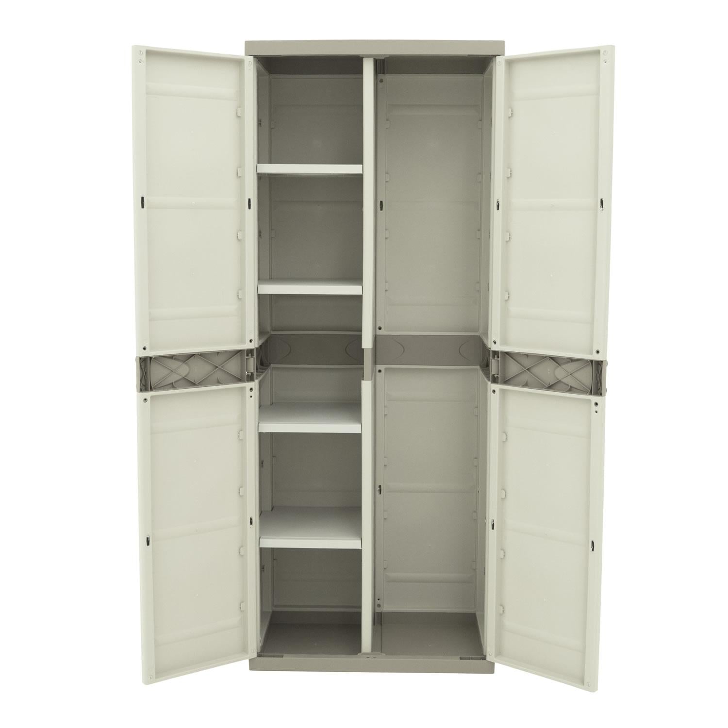 Este armario escobero está compuesto por dos puertas frontales y cuatro estantes regulables que se pueden adaptar o retirar según el tipo de almacenamiento requerido. Su estructura de resina plástica es resistente a la intemperie, lo que lo convierte en una solución versátil para terrazas, trasteros, garajes, jardines o zonas de limpieza. Gracias a su diseño modular, puede integrarse fácilmente con otros elementos de la gama Space Saver.