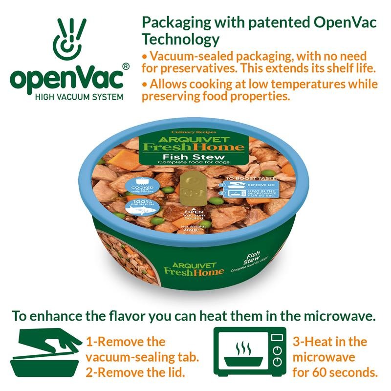 • Envase con Tecnología patentada OpenVac. Sellado al vacío sin necesidad de conservantes, prolongando así su vida útil. Permite cocinar a baja temperatura preservando las propiedades de los alimentos.