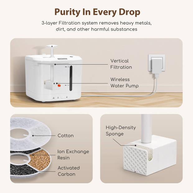 Filtra las impurezas del agua por purificación circular, eliminación de cloro, olor e iones de metales pesados residuales, previene eficazmente enfermedades del tracto urinario en las mascotas.