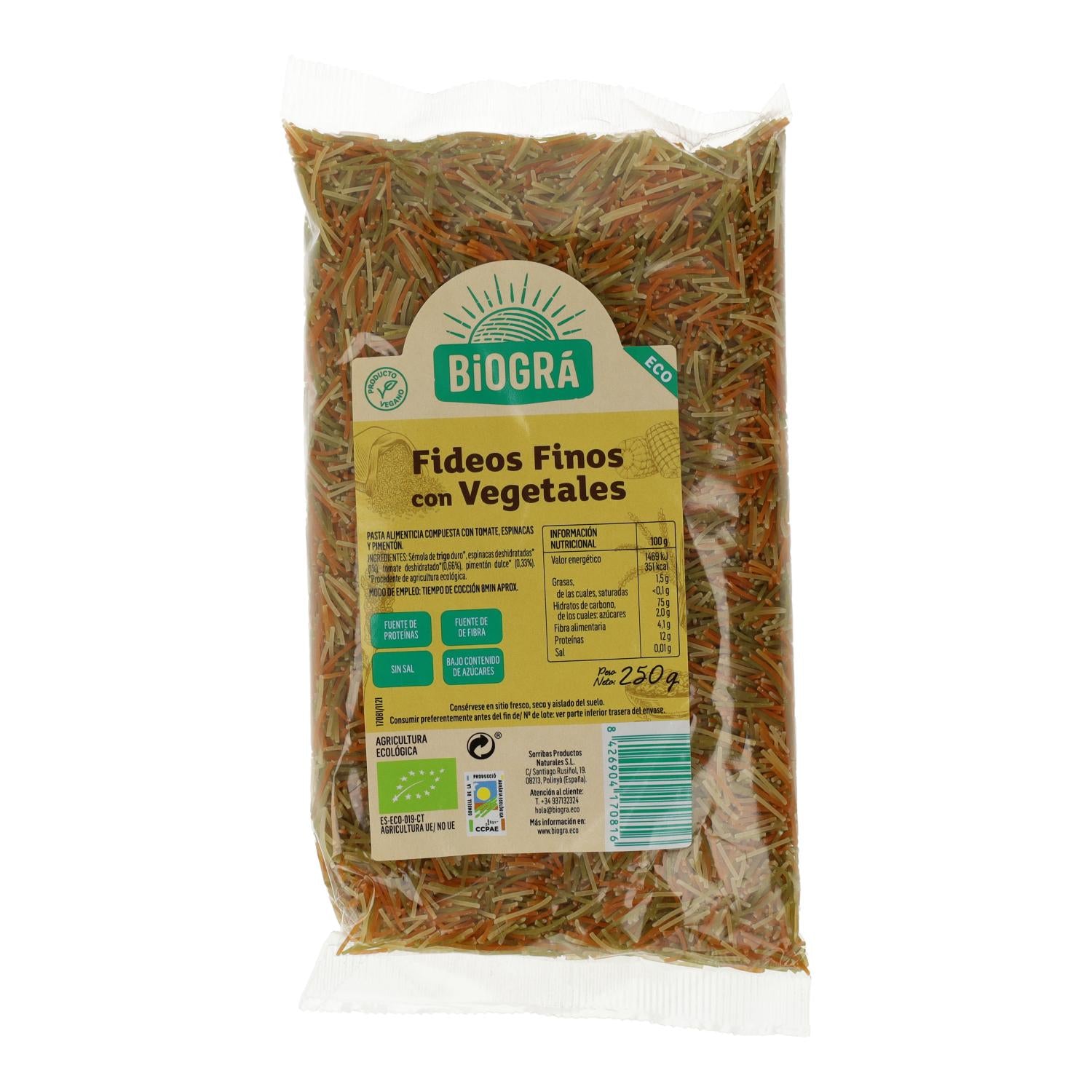 Pasta ecológica tipo fideo fino elaborada con sémola de trigo duro y enriquecida con verduras deshidratadas como espinacas, tomate y pimentón. Gracias a su sabor suave y composición vegetal, es ideal para combinar con salsas, mantequilla o en sopas ligeras. Producto apto para veganos y certificado de alimentación ecológica.