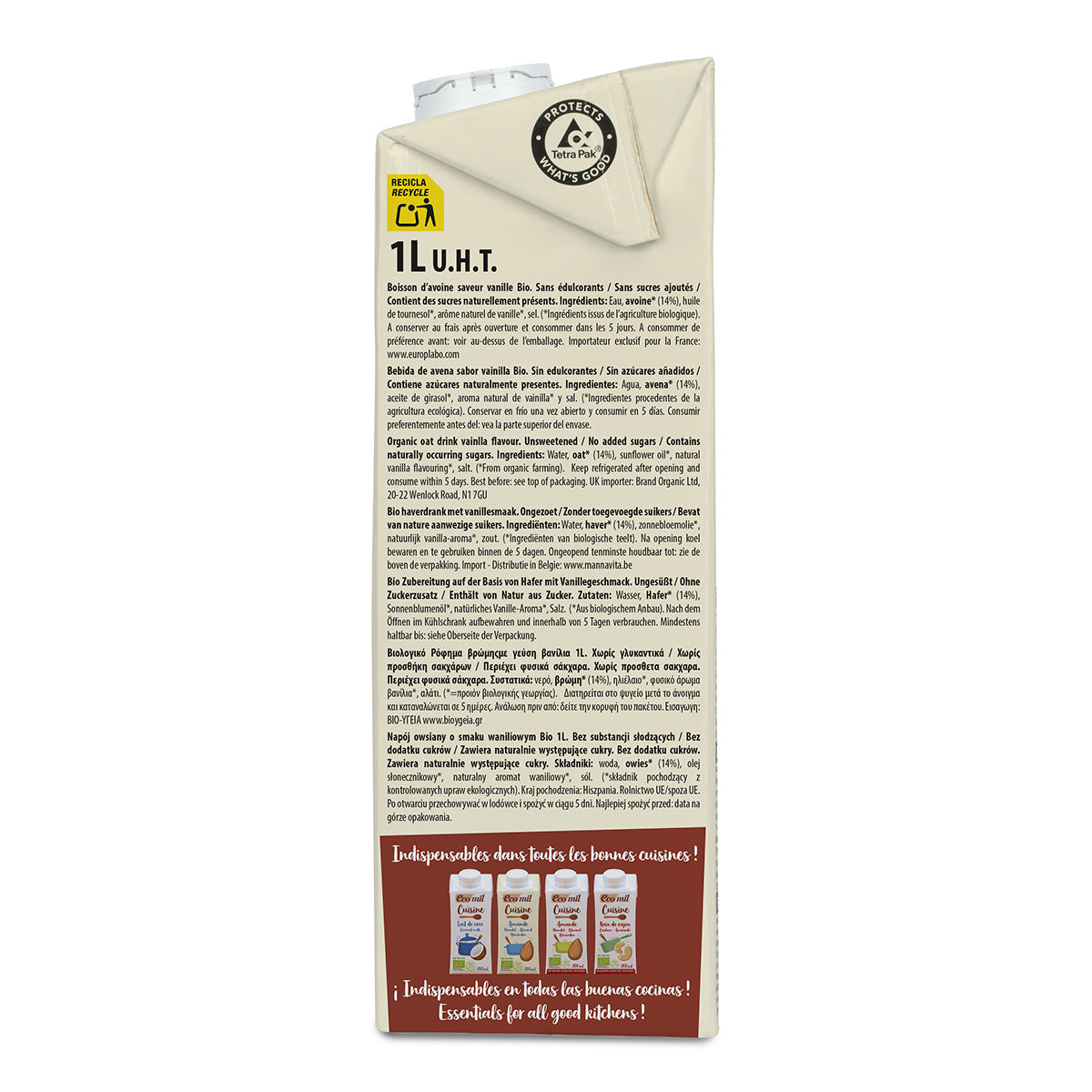 Bebida vegetal ecológica de avena con sabor vainilla, elaborada sin azúcares ni edulcorantes añadidos. Contiene únicamente los azúcares naturalmente presentes. Es una alternativa vegetal a la leche, de sabor suave y aromático, ideal para consumir sola o utilizar en bebidas calientes, desayunos y recetas dulces.