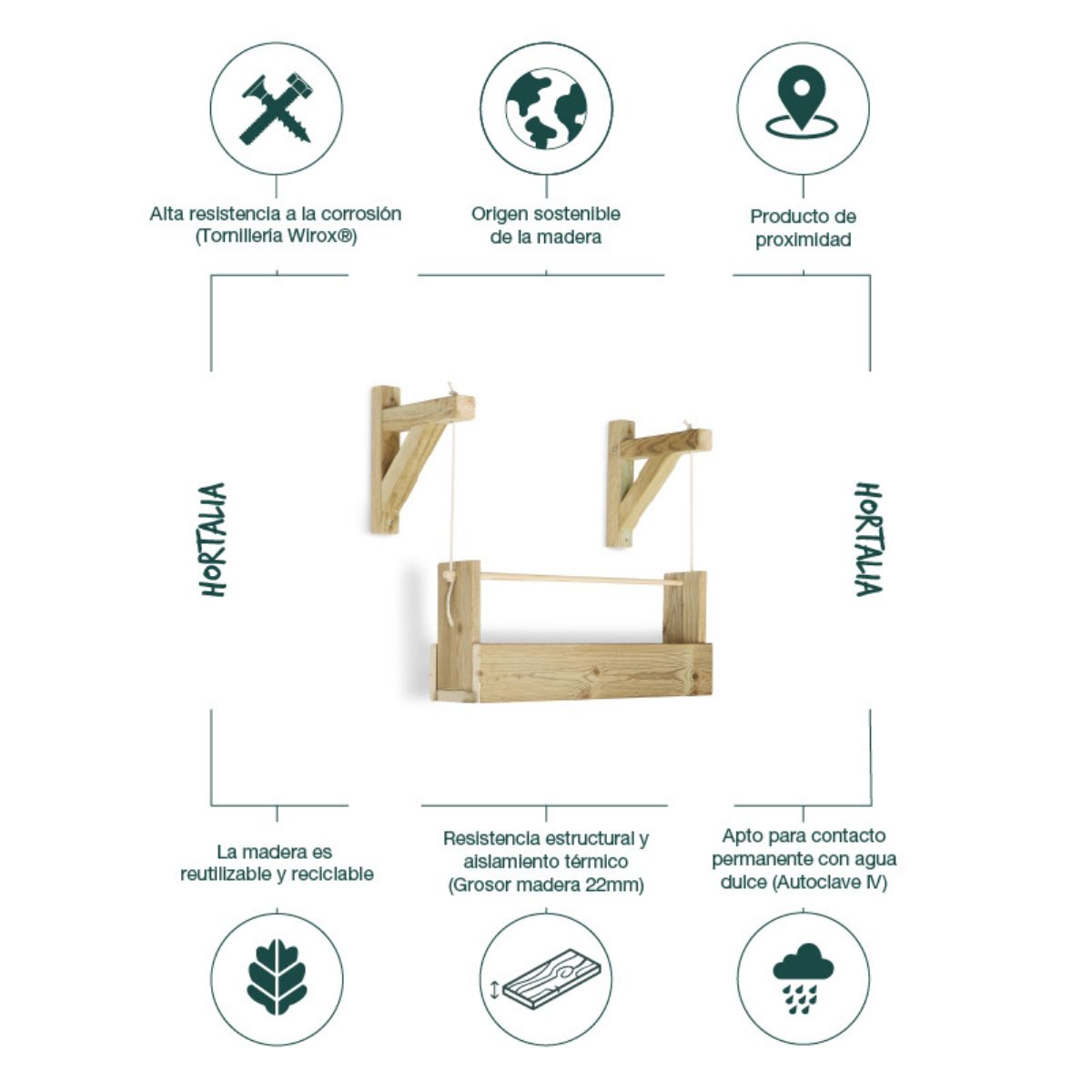 Jardinera colgante de madera tratada, perfecta para decorar paredes tanto en el interior como en el exterior de tu vivienda.