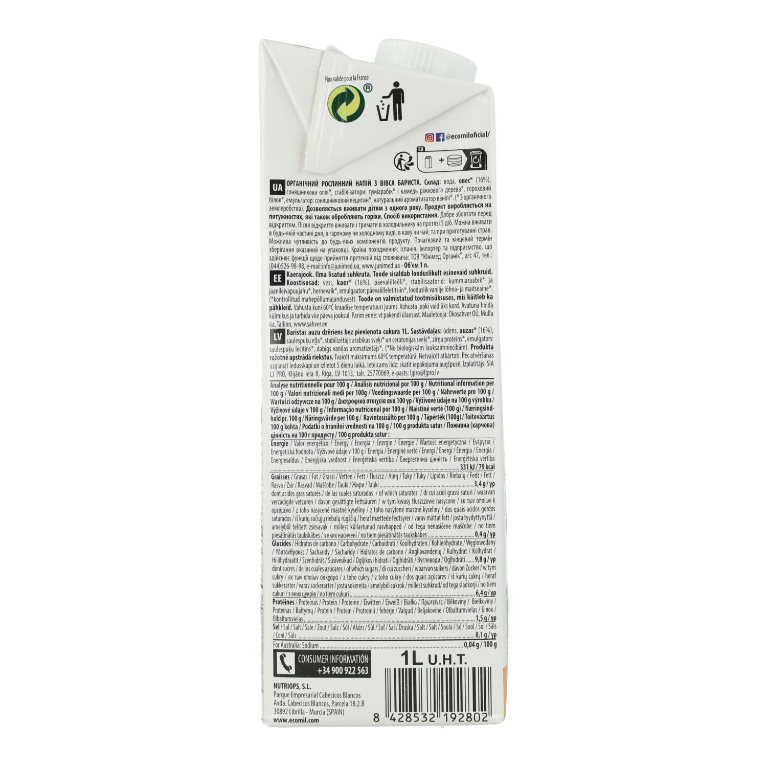 Tutte le informazioni su "Bevanda vegetale Barista Avena BIO EcoMil 1 L"