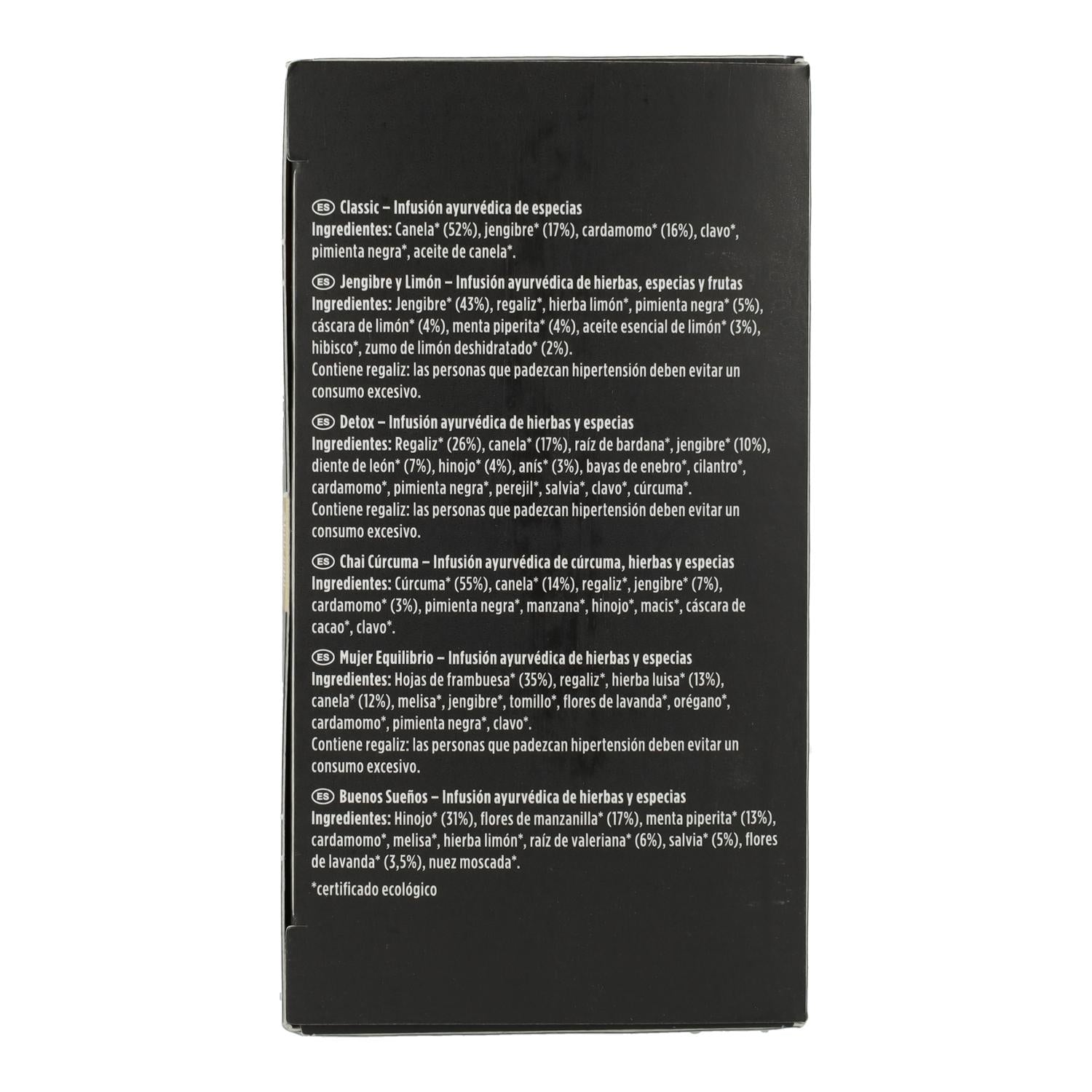 - Chai Cúrcuma: Cúrcuma* (55%), canela* (14%), regaliz*, jengibre* (7%), cardamomo* (3%), pimienta negra*, manzana*, hinojo*, macis*, cáscara de cacao*, clavo*.