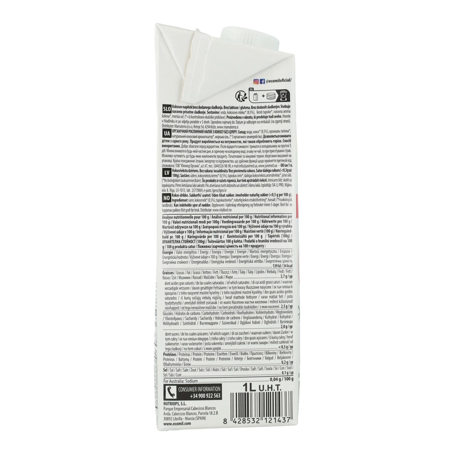 Wszystkie informacje na temat "Napój roślinny kokosowy bez cukru, bezglutenowy i bez laktozy Ecomil 1 l"