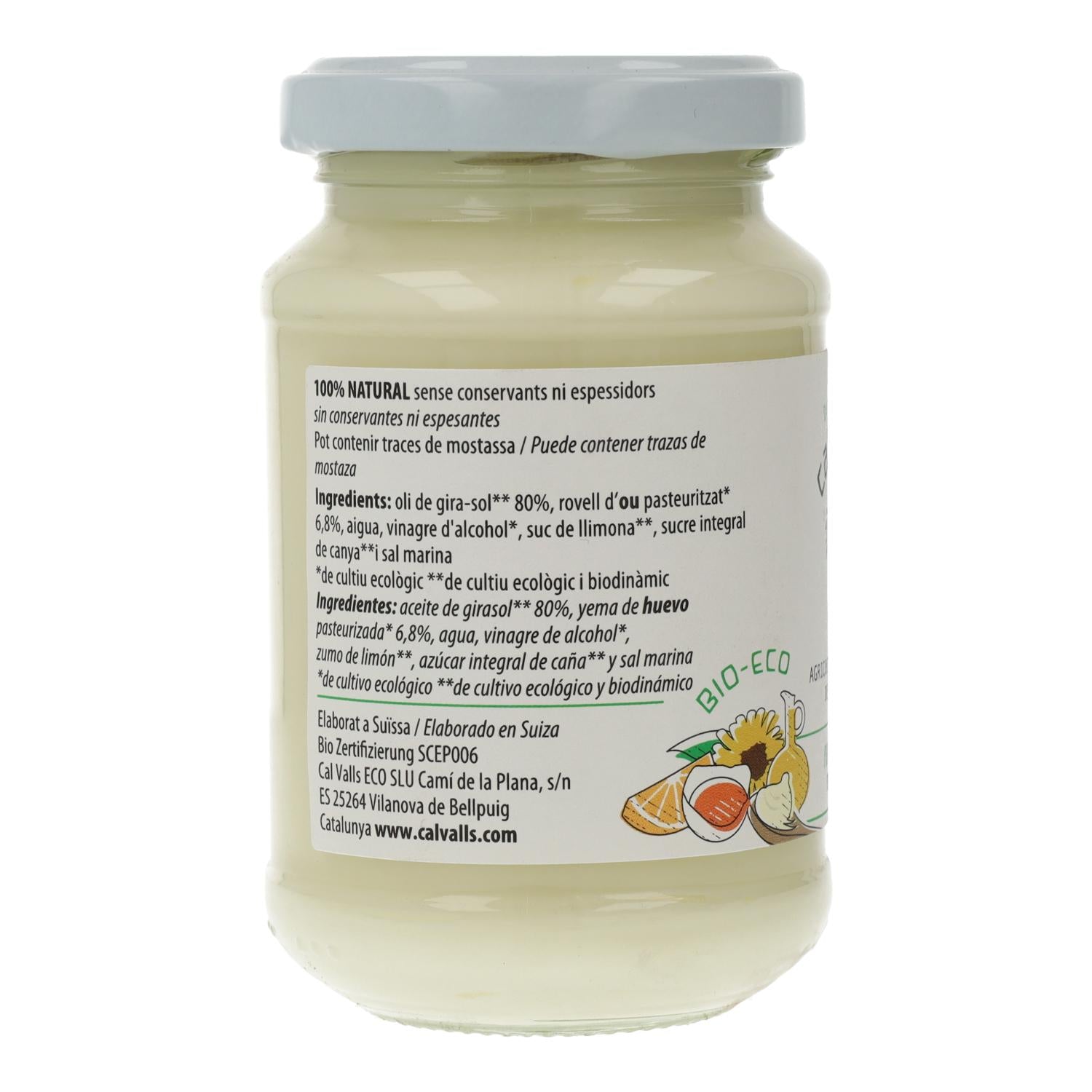 Aceite de girasol* (80%), yema de huevo pasteurizada* (6,8%), agua, vinagre blanco*, zumo de limón*, azúcar integral de caña*, sal marina.