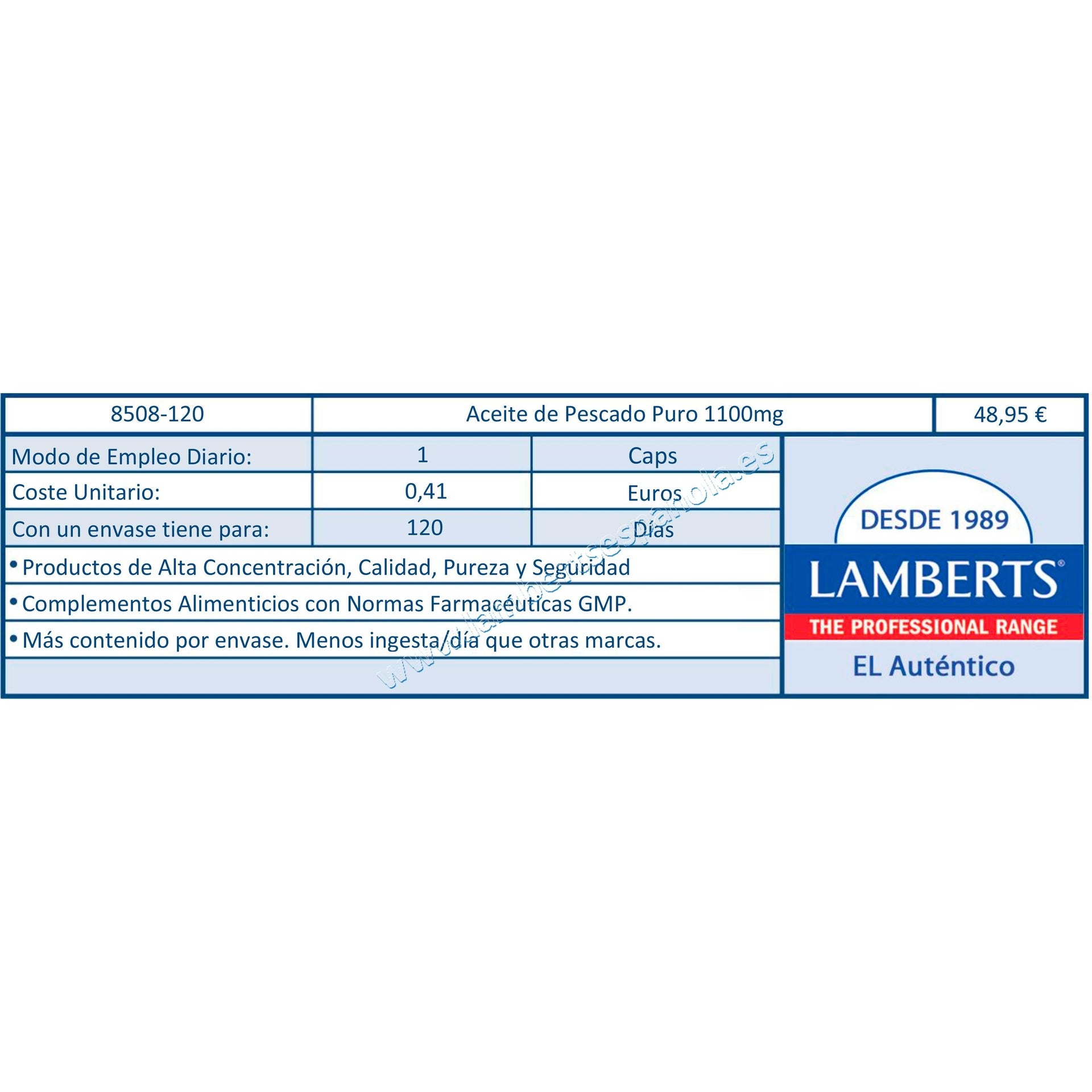 El Aceite de Pescado Puro Lamberts es un suplemento nutricional de alta calidad que proporciona ácidos grasos esenciales omega-3, específicamente EPA (ácido eicosapentaenoico) y DHA (ácido docosahexaenoico). Estos nutrientes son fundamentales para mantener la salud cardiovascular, cerebral y ocular. Cada cápsula contiene 1100 mg de aceite de pescado purificado, garantizando una concentración óptima de estos ácidos grasos esenciales.