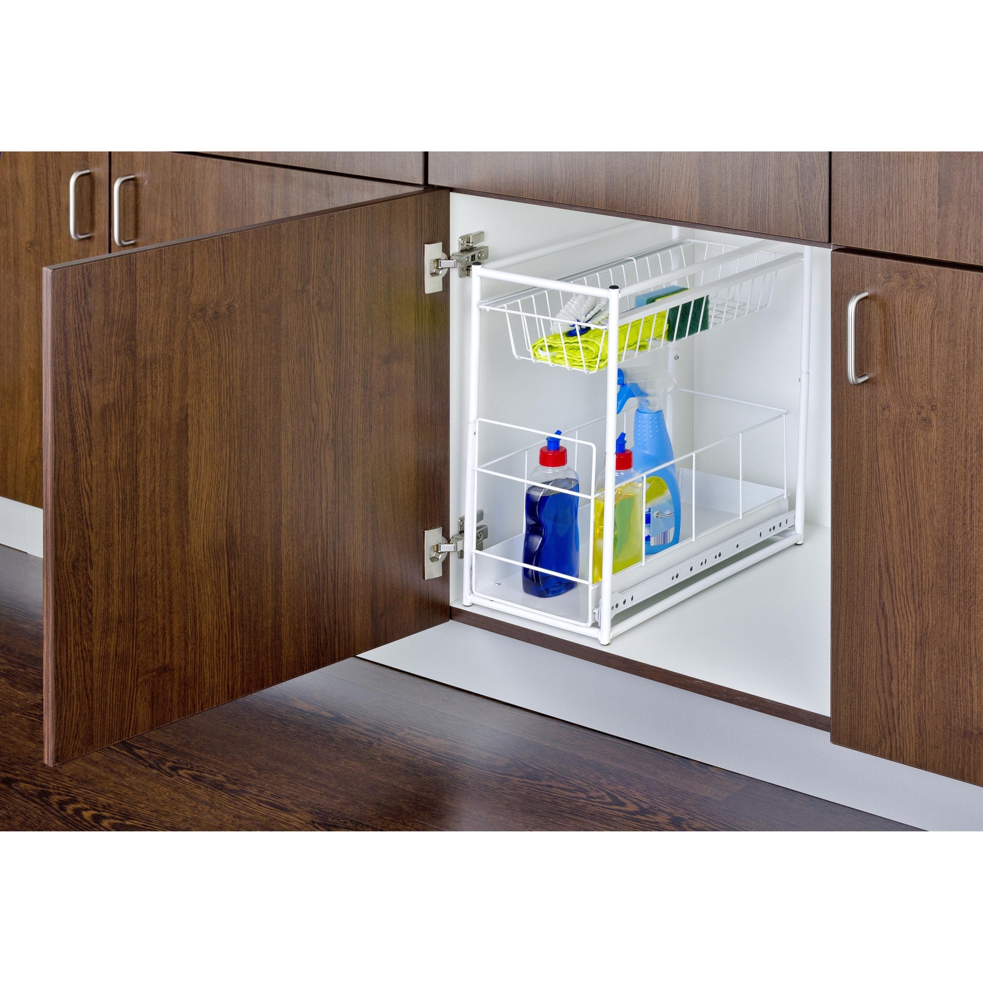 Fácil instalación en los armarios de base de la cocina. Para el montaje en el suelo del armario. Dos cestas telescópicas para almacenamiento.