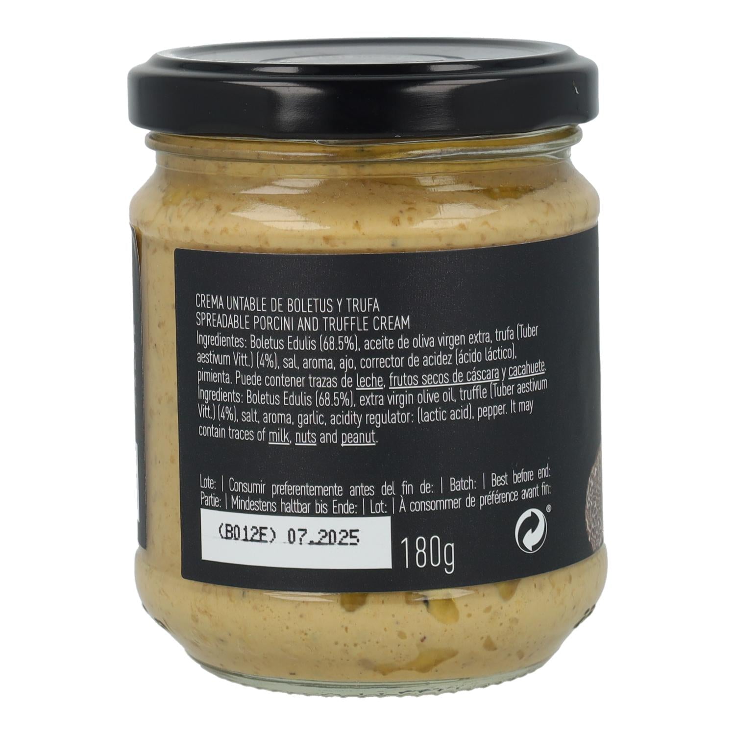 Boletus edulis (68,5%), Aceite de Oliva Virgen Extra, Trufa Negra de verano (Tuber aestivum Vitt.) (4%), Pan Rallado (harina de trigo (gluten), agua, levadura, sal), sal, ajo, corrector de acidez (ácido láctico), pimienta.