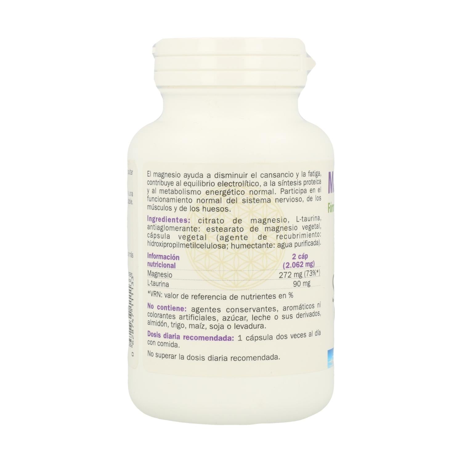 Citrato de magnesio, L-taurina, antiaglomerante: estearato de magnesio vegetal,cápsula vegetal (agente de recubrimiento: hidroxipropilmetilcelulosa; humectante: agua purificada).