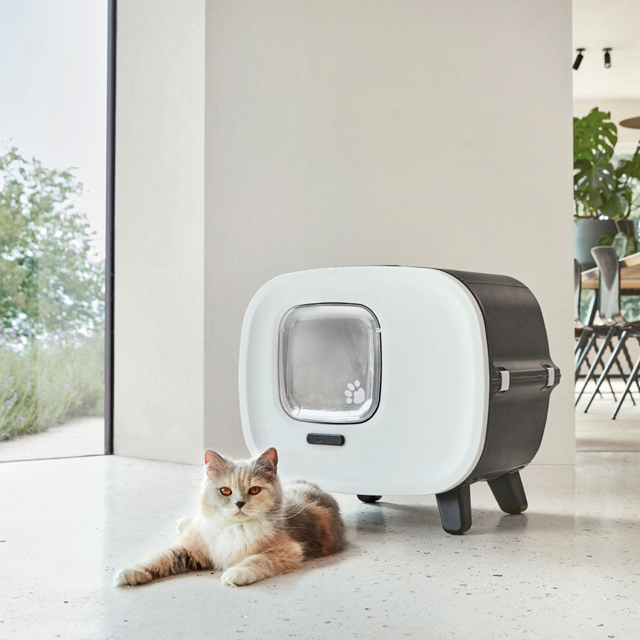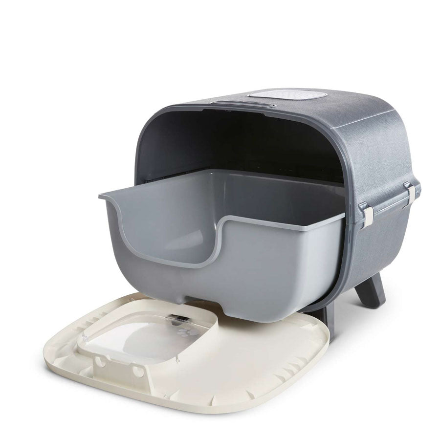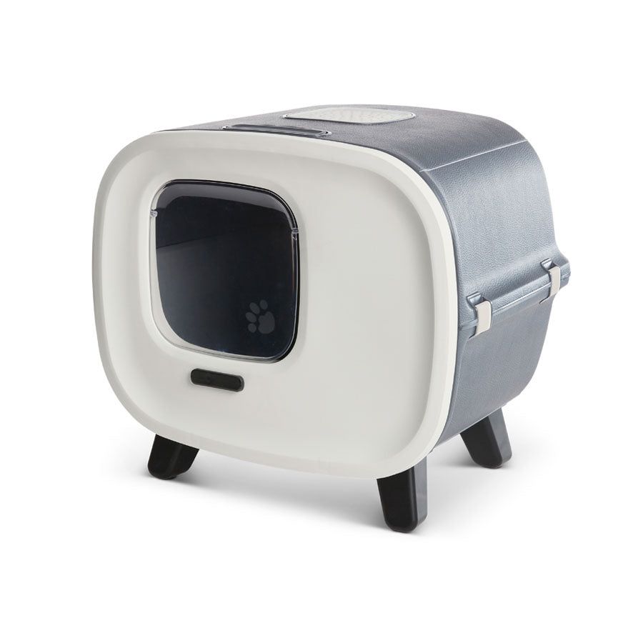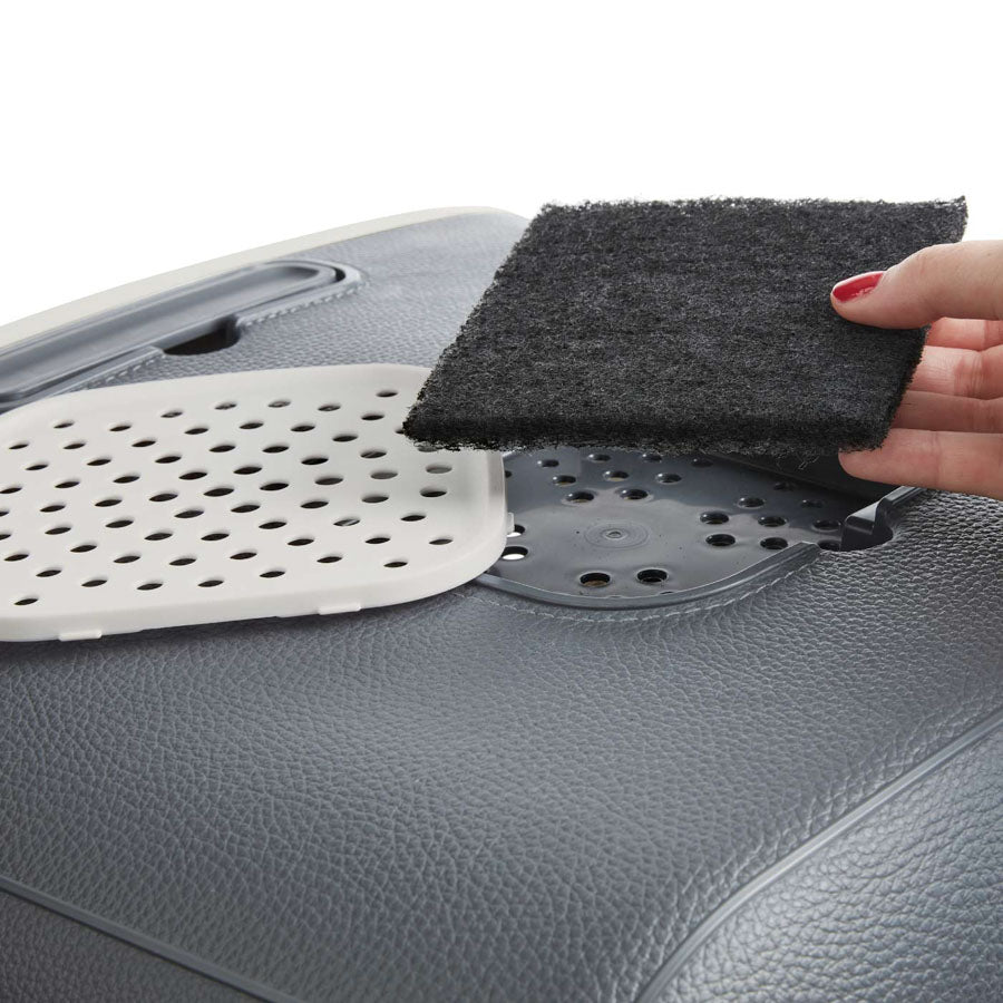 Savic toilette para gatos Mira, por fin no es necesario esconder el WC de su gato. Atractivo y moderno diseño, fabricada en material plástico con acabados en simil piel, dando un toque lujoso a su hogar. Dispone de 4 patas con topes antideslizantes, puerta frontal abatible y filtro de carbón activo de alto rendimiento. Para reemplazar la arena basta con fijar la puerta y separar la parte frontal de la gatera para acceder a la bandeja. Color antracita. Medidas: 55x44x50 cm