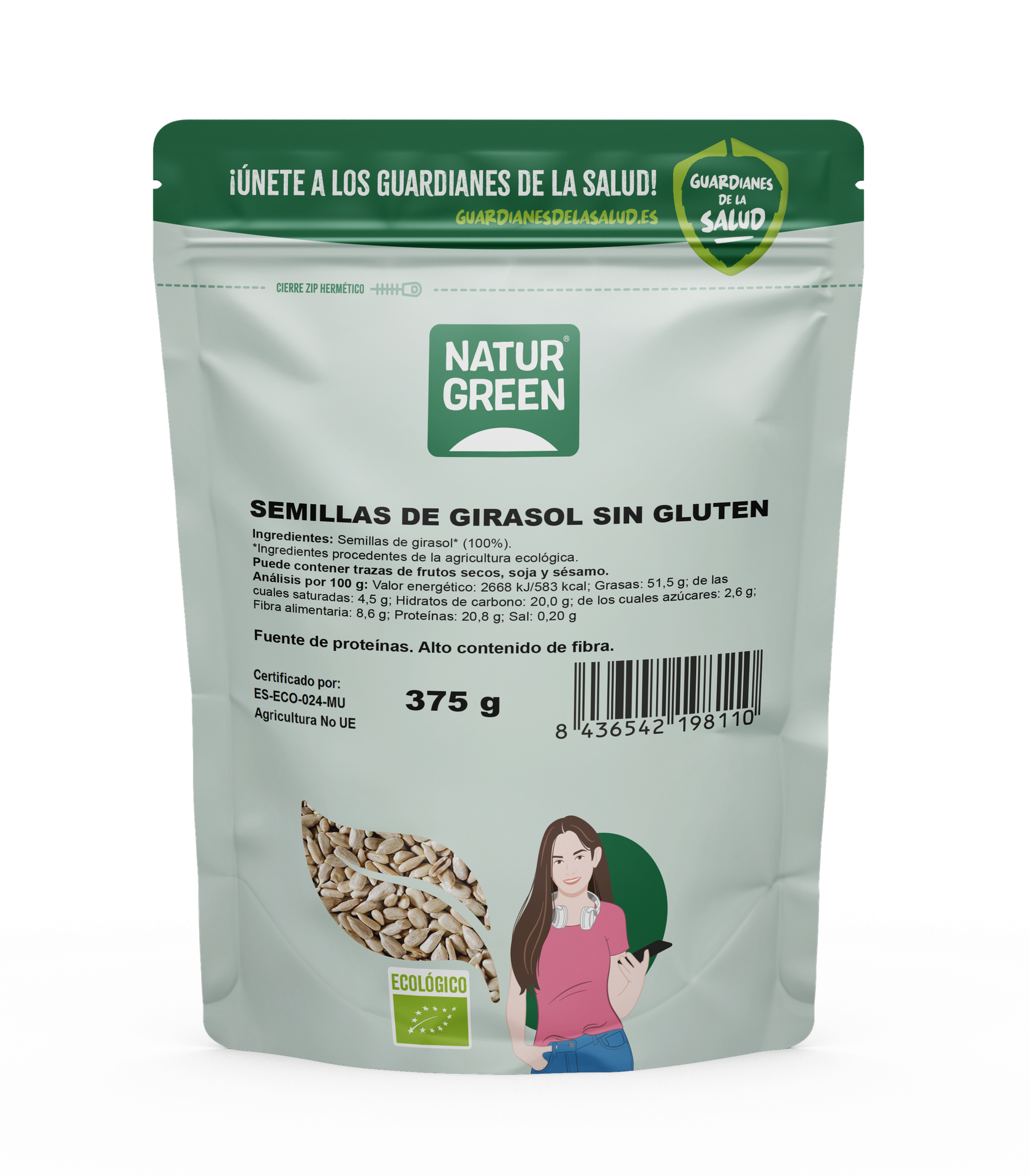 Ingredientes: Semillas de girasol* (100%). *Ingredientes procedentes de Agricultura Ecológica. "Este producto se fabrica en una planta donde se manipulan frutos secos, soja y sésamo"