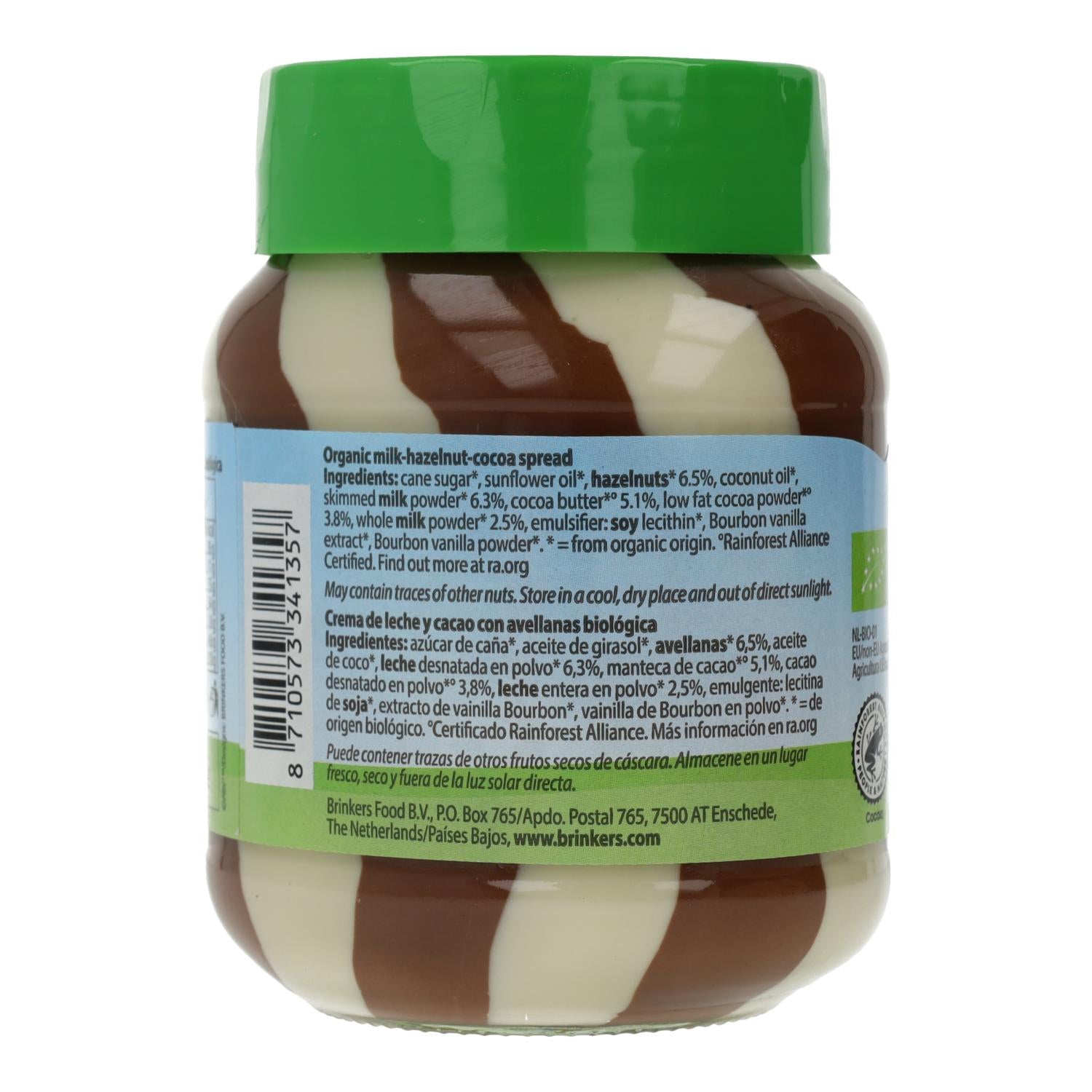 Crema de chocolate dúo, deliciosa, suave y untuosa, elaborada con ingredientes de alta calidad y certificación ecológica. Primera crema de chocolate bio con certificación UTZ, que garantiza agricultura sostenible y mejores condiciones para agricultores y el planeta. Contiene aceite de girasol y un equilibrado sabor a avellana y cacao.