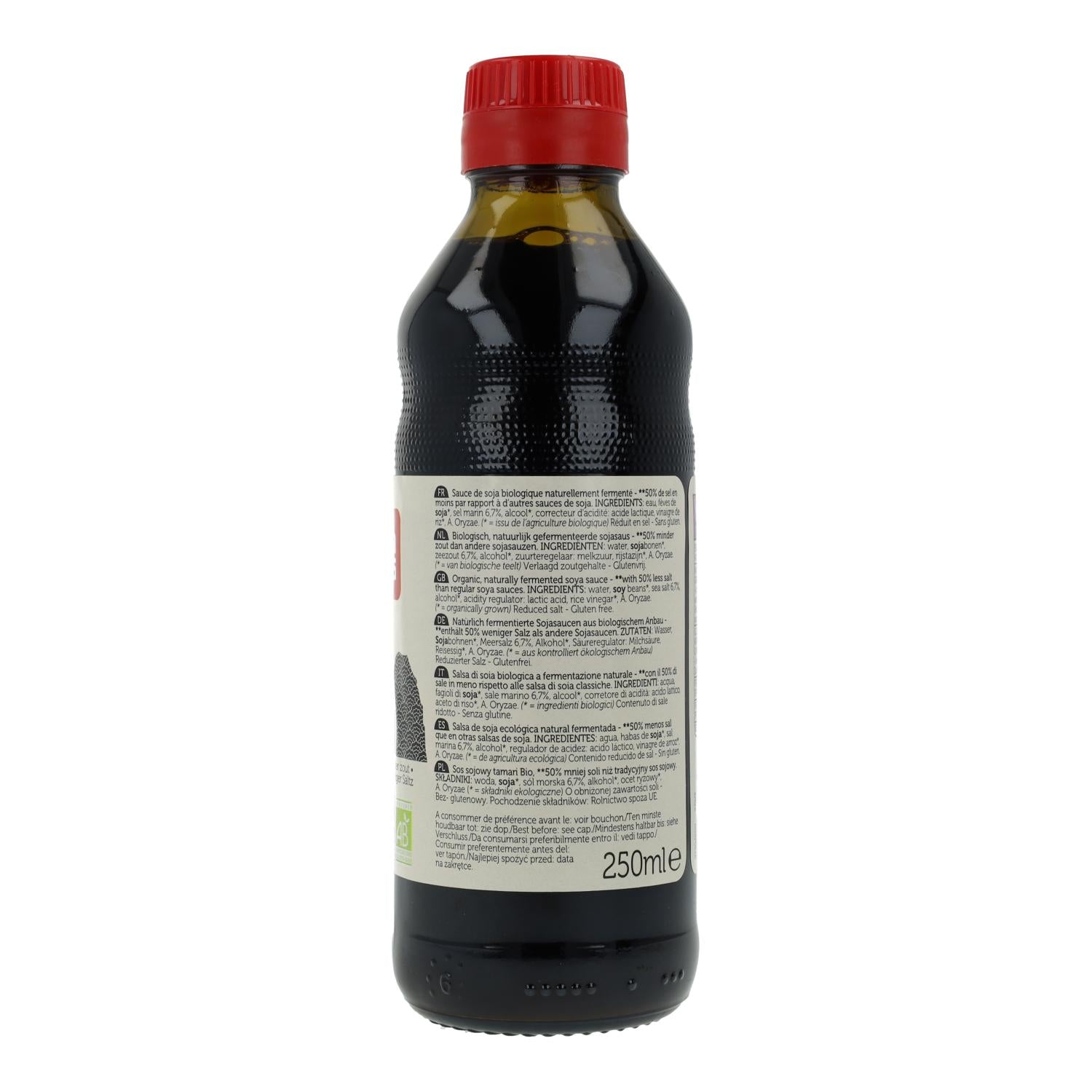 Ingredientes: agua, habas de SOJA*, sal marina 6,7%, alcohol*, regulador de acidez: acido láctico, vinagre de arroz*, A. oryzae. *de agricultura ecológica