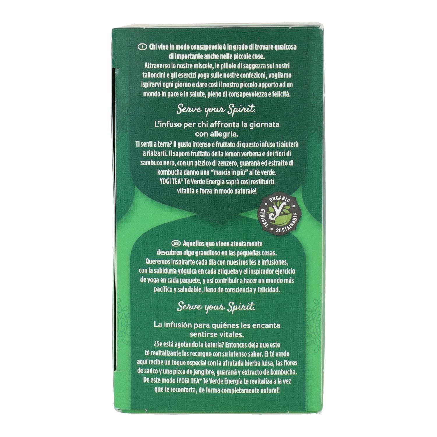 Yogi Tea Bio Té Verde Energía es una infusión ayurvédica elaborada con té verde Sencha y una mezcla de hierbas y especias como guaraná, jengibre, hierba limón y flores de saúco. Está dirigida a personas que buscan un impulso natural de energía y vitalidad durante el día. Ideal para consumo diario, especialmente en momentos en que se requiere concentración y refresco.